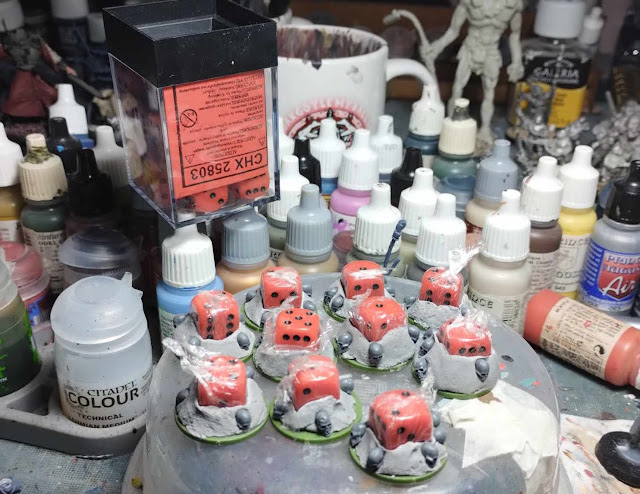 To make those, I simply took Renedra bases, stuck some cheap air drying clay and some skulls and punched some dice into them with some plastic wrap to avoid ruining my dice.